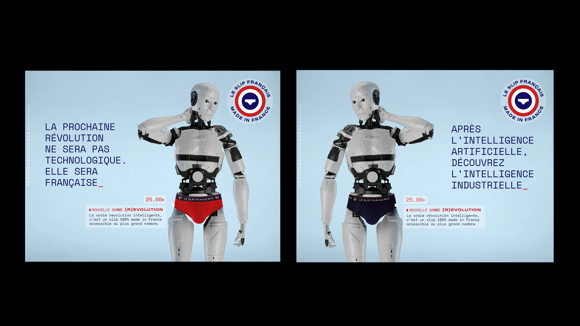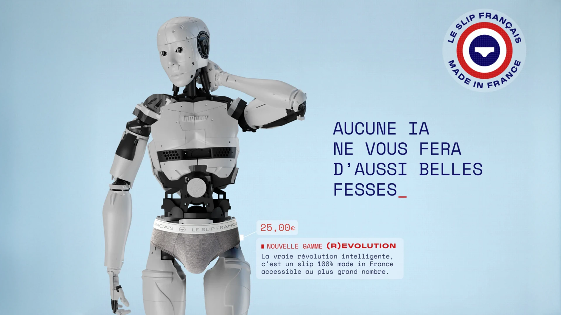 Révolutionner le prêt-à-porter et démocratiser le "Made in France", c'est le défi culotté du Slip Français avec sa gamme (R)ÉVOLUTION. Pour le lancement, ils font poser AL avec un slip (r)évolution, un robot mais il devient étrangement français : baguette, râlage et revendications salariales !