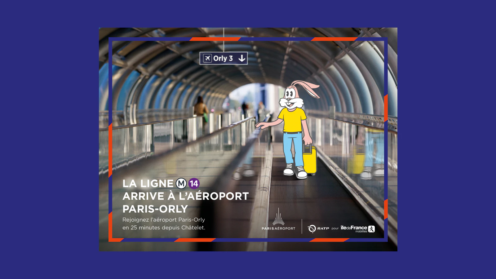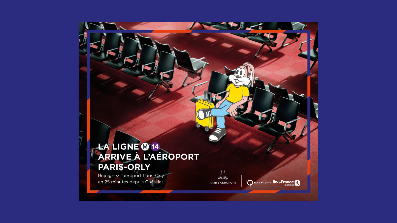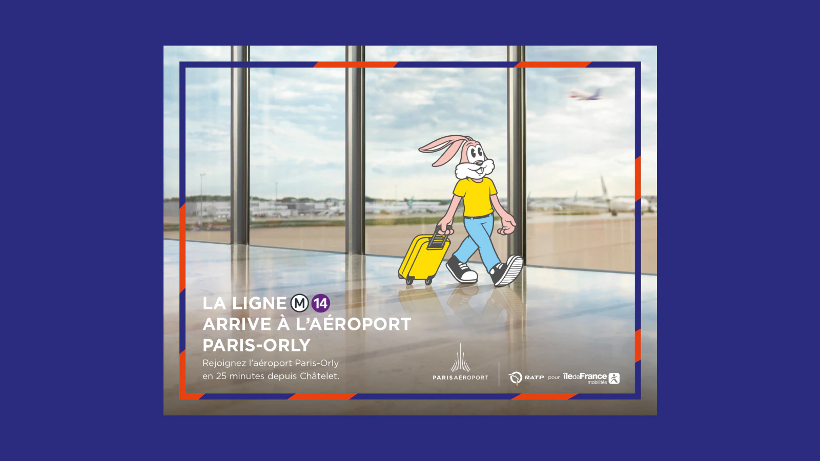 Une campagne événement feat. l’iconique Serge, lapin du métro parisien, afin de célébrer l’arrivée de la ligne 14 à Paris-Orly. Serge le Lapin, mascotte de la RATP, débarque par le métro à Orly, où il admire les avions et se prépare à décoller.