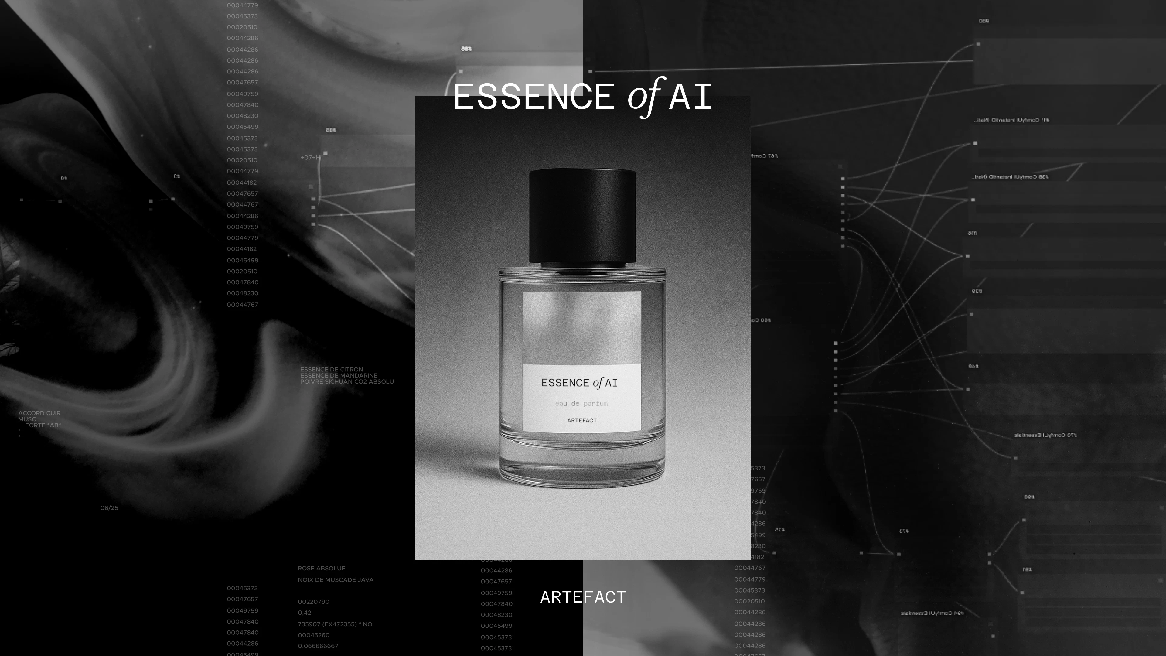 Essence of AI incarne la précision froide et métallique de la technologie et de l'innovation IA, représentée par des notes de tête vives et ozoniques et des aldéhydes métalliques. Le parfum évolue vers un cœur vibrant et créatif, l’ambre chaud et résineux et les épices fumées représentent la touche humaine, la créativité et l'énergie audacieuse et intuitive de l'expression artistique. Cette dualité capture l'essence de la philosophie d'Artefact : l'art et le fait en parfaite synergie.